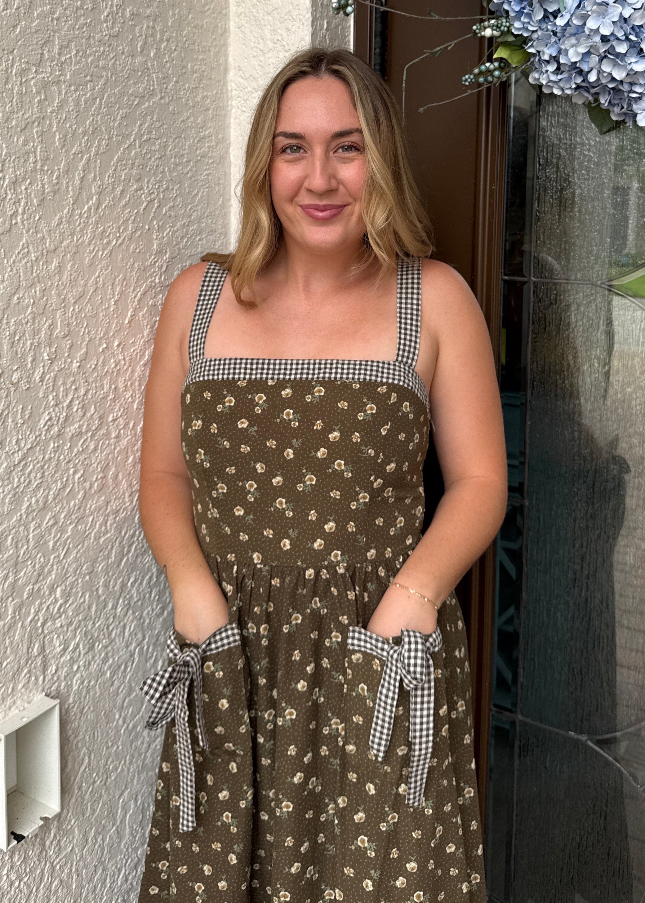 The perfect fall midi dress! Functional pockets with a cute gingham bow detail. This square neck sleeveless floral apron midi dress can be dressed up or down & worn with a cardigan or jacket to keep you warm on cooler days. Perfect for my neutral color loving girlies.