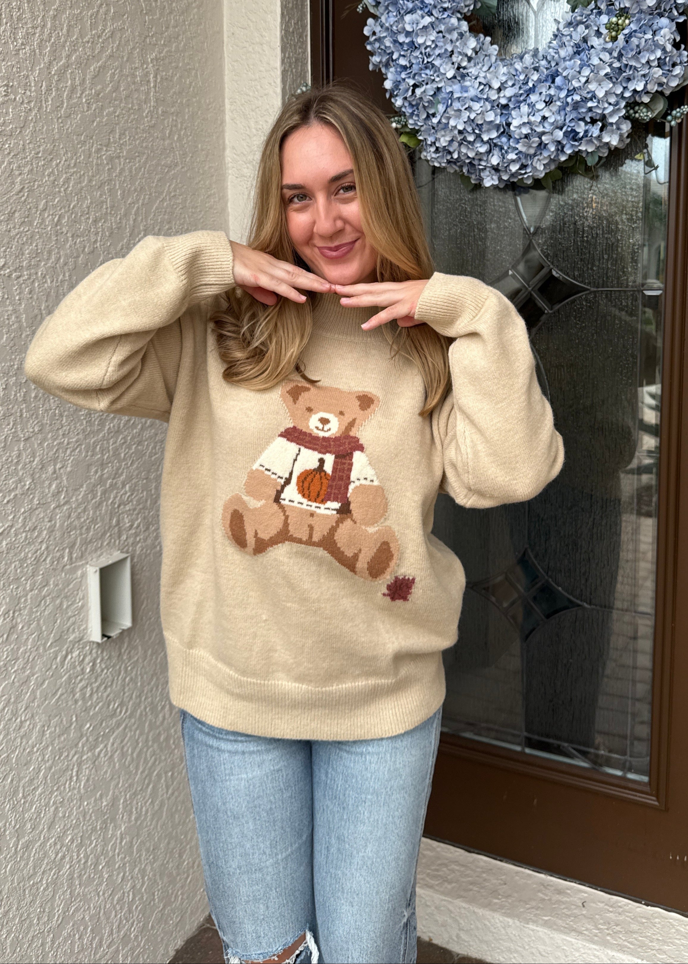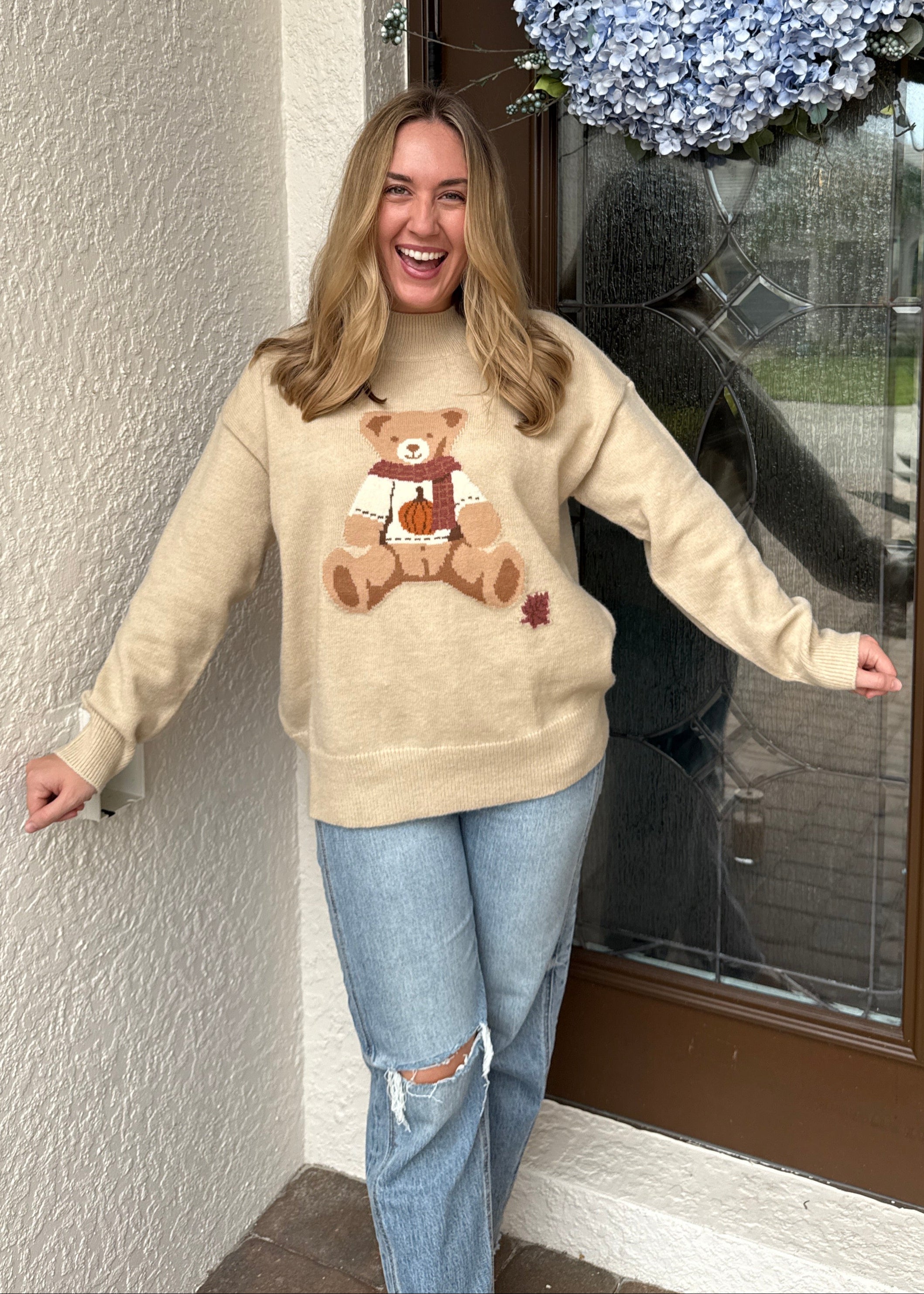 You need this adorable bear sweater in your life not only for this year, but for many to come. It'll be something you look forward to wearing every fall! Mock neck bear sweater, soft tan color. Bear is wearing a little pumpkin sweater & scarf.