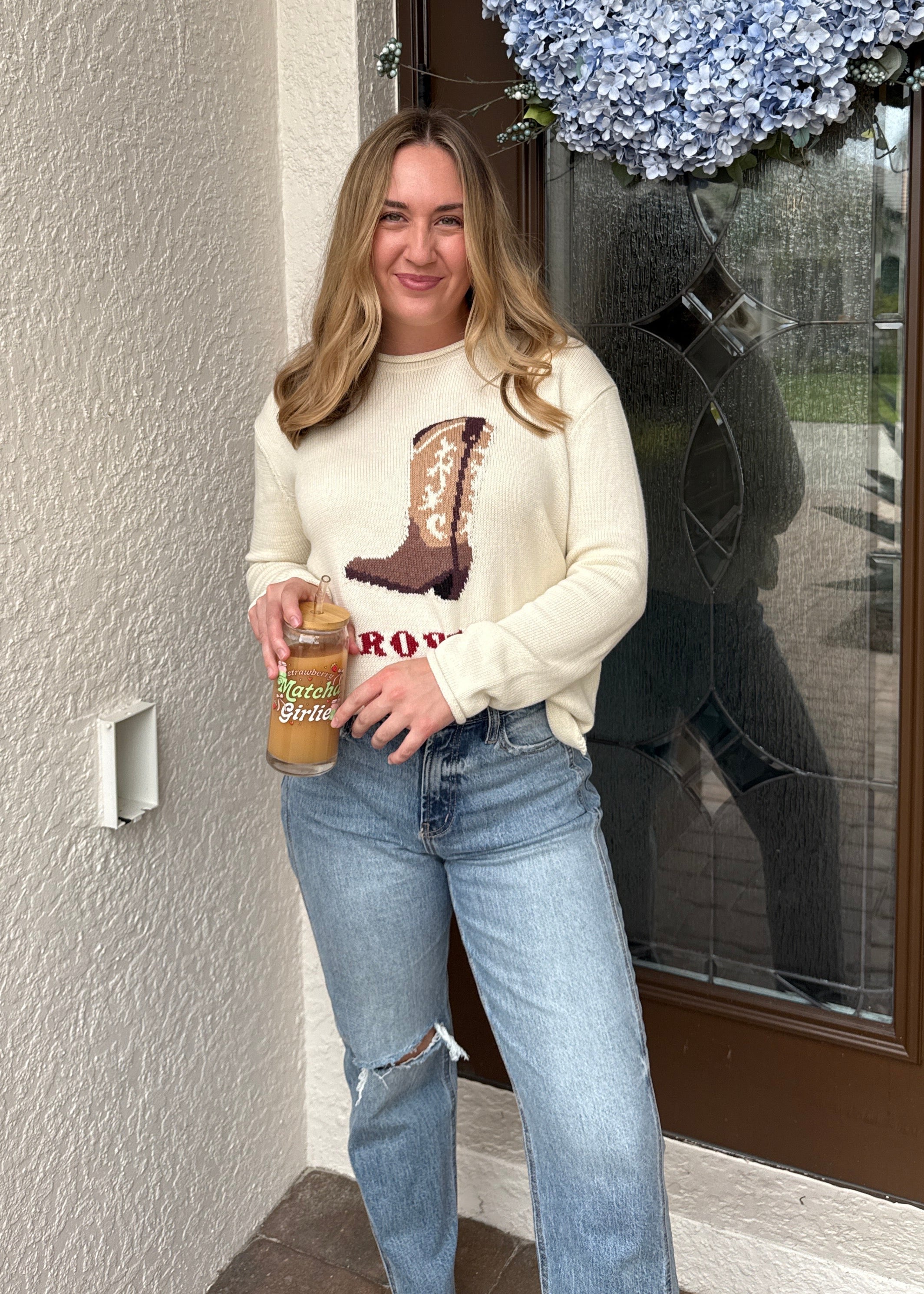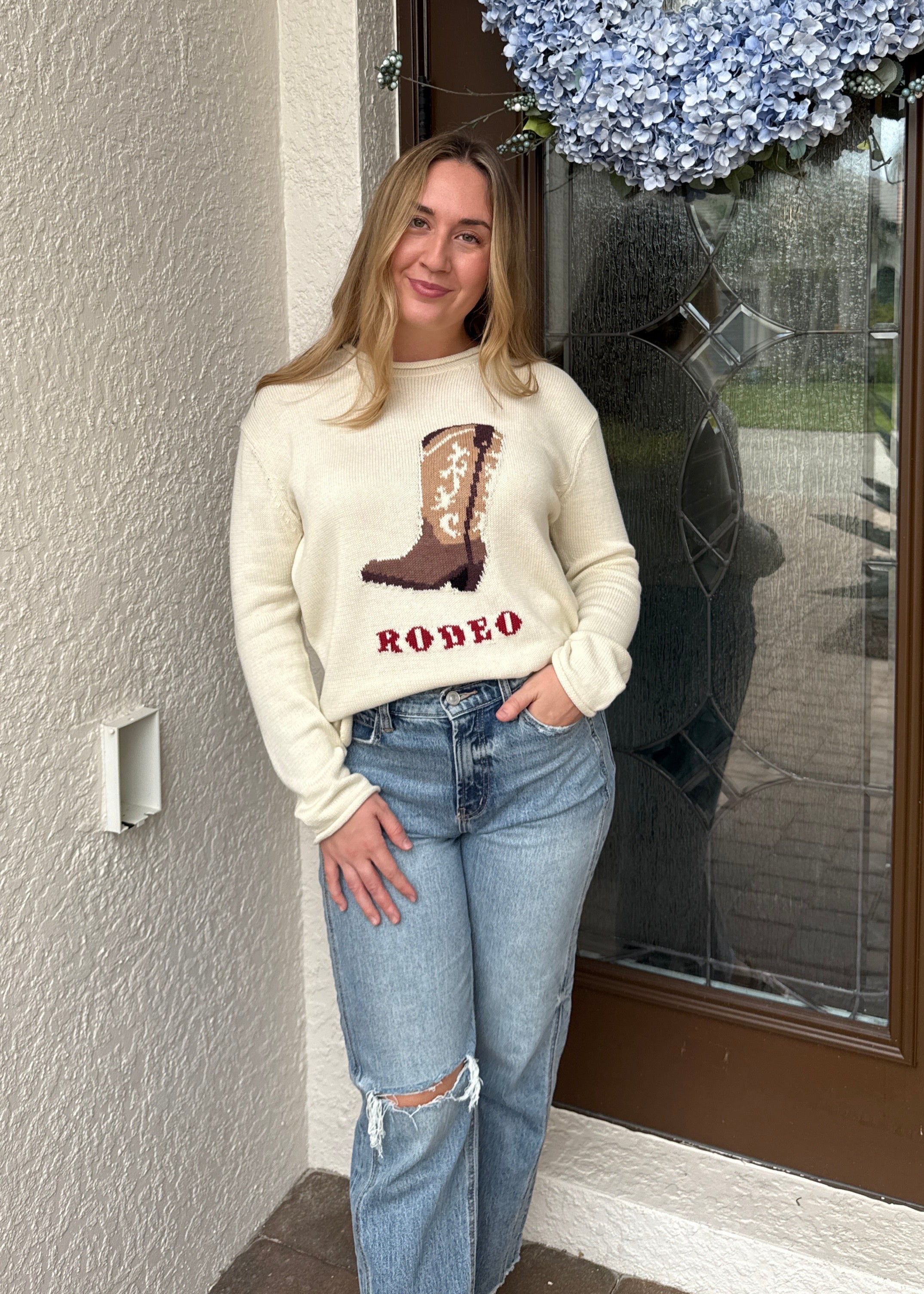 This round neck, long sleeve "rodeo" graphic sweater is a must have. So fun & easy to throw on to make any outfit cute! So soft & comfy too. Off white/cream colored.
