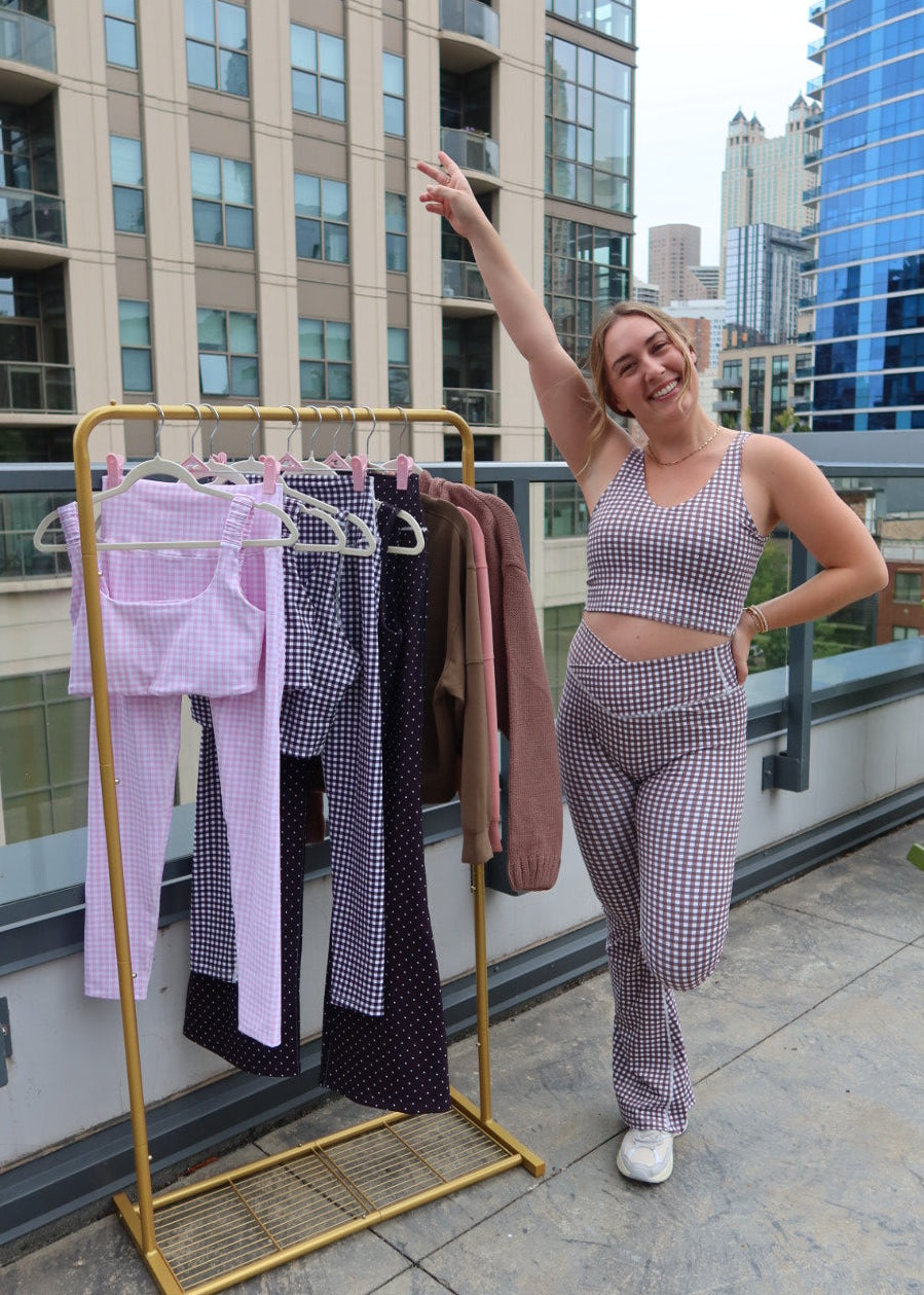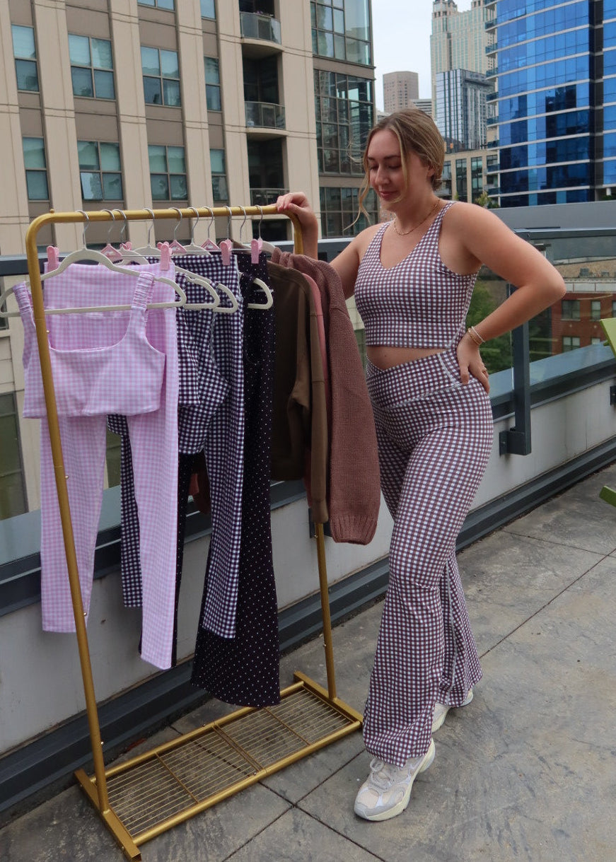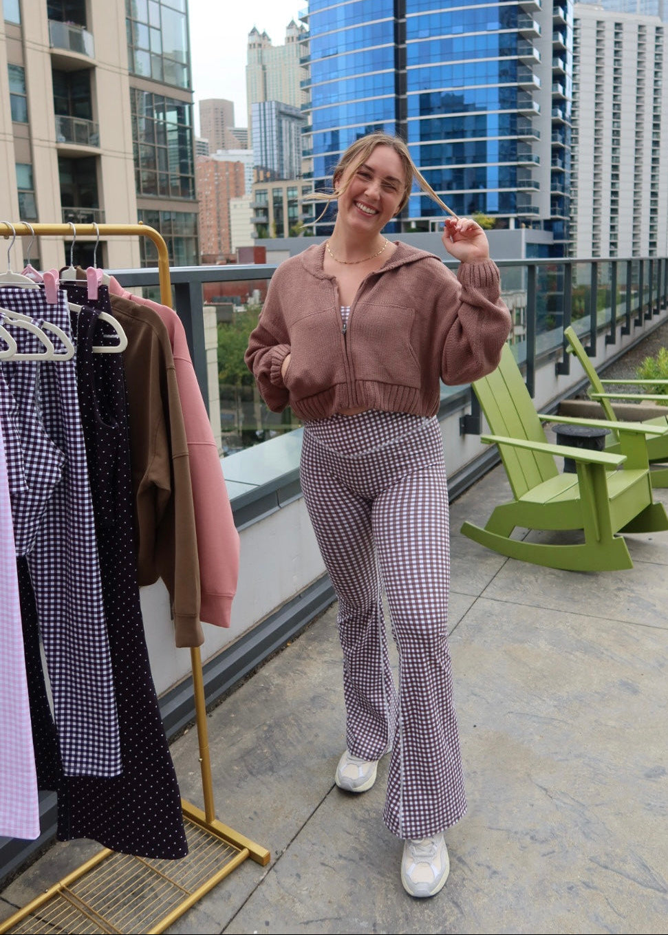 Brown Gingham Print High Waist Crossover Flare Legging - pair them with our Brown Gingham V-Neck to complete the set!