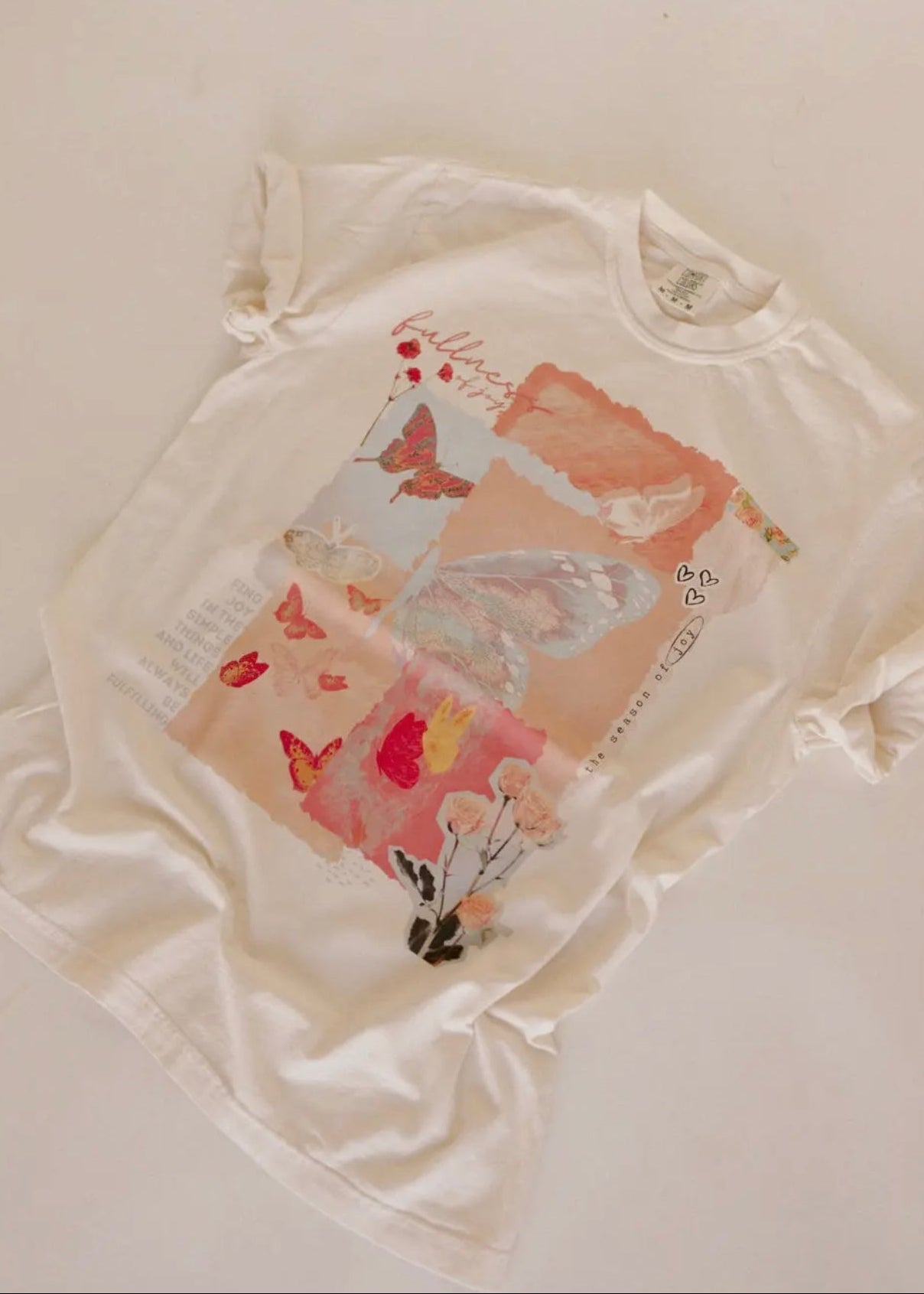 The sweetest butterfly design, off white/cream colored tee. "Fullness of Joy" on the top left, "season of joy" on the right side, & "find joy in the simple things & life will always be fulfilling" on the bottom left.
