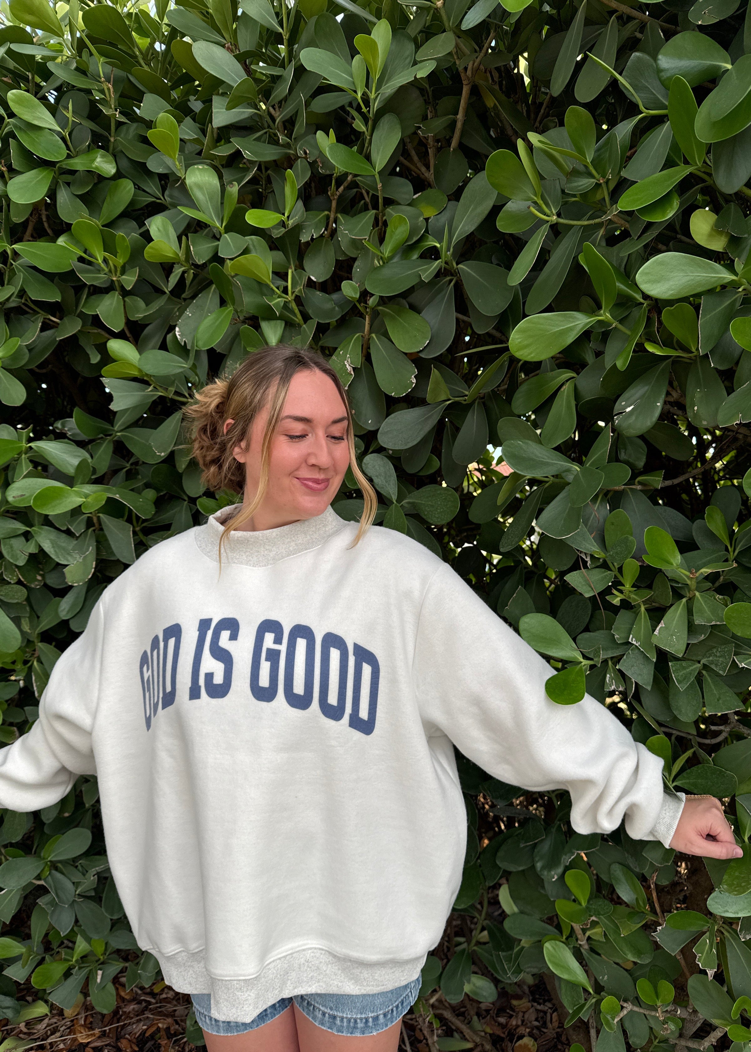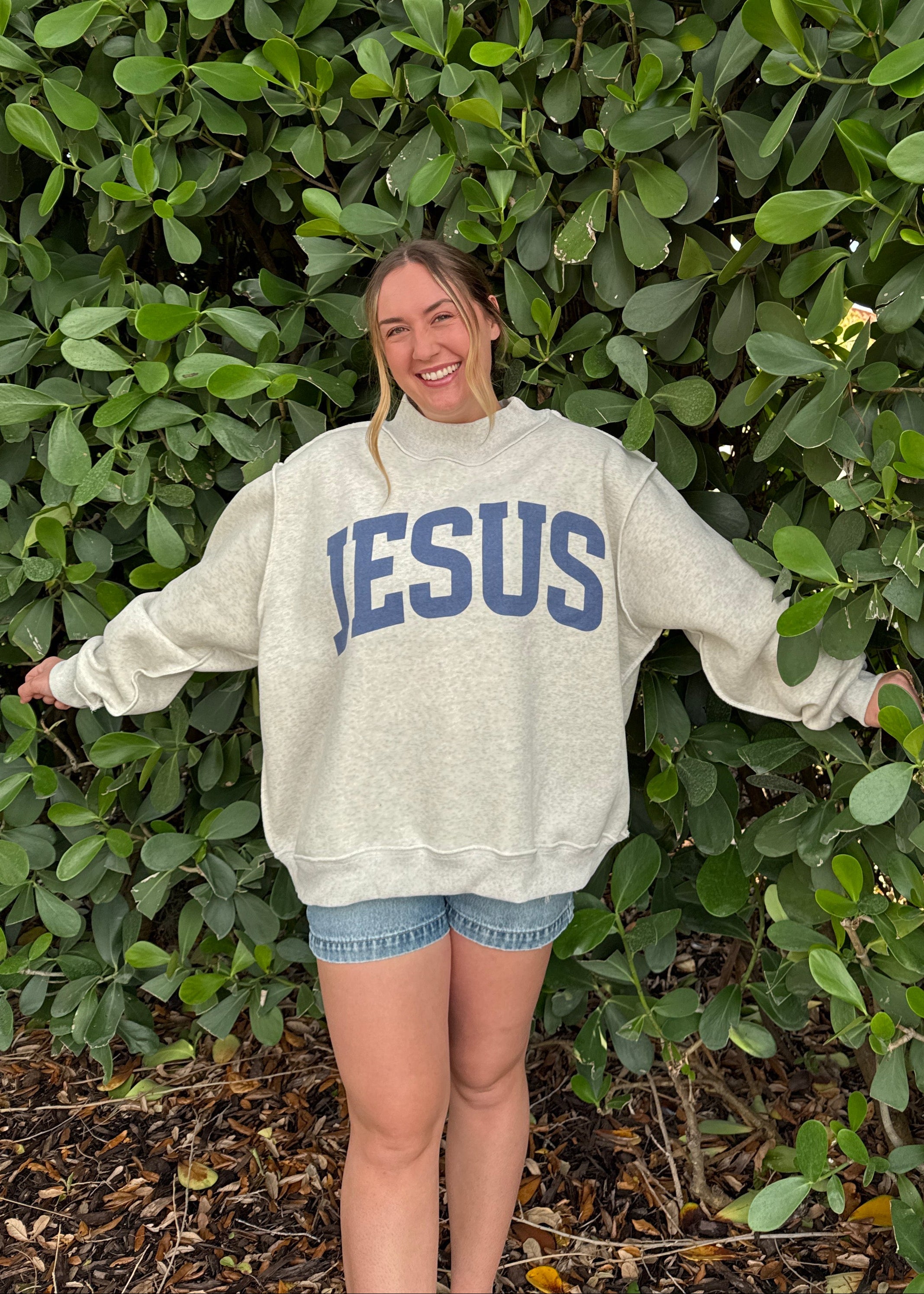 Ash Grey Reversible Mock Neck Sweatshirt! "Jesus" printed on one side & "God is Good" printed on the other side. Text is a vintage blue color.