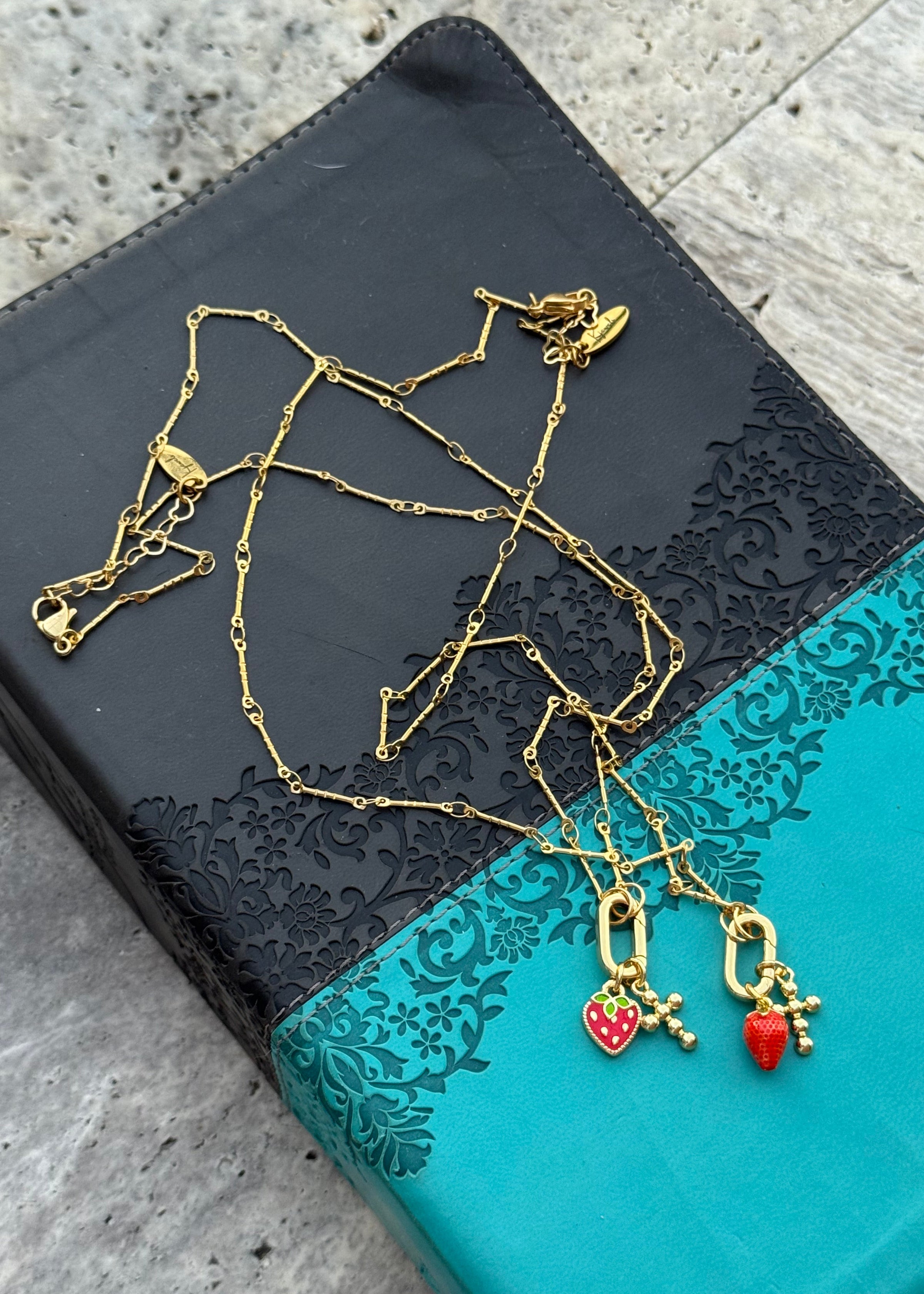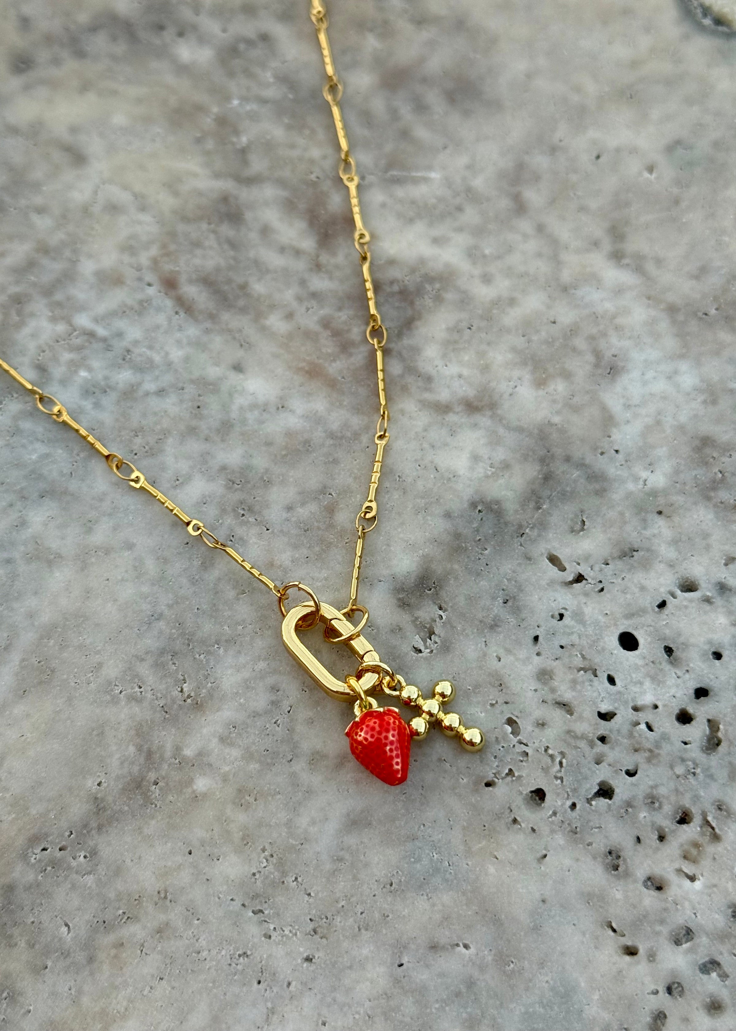 Gold chain necklace with extender & strawberry + cross charm to represent the fruit of the Spirit (: